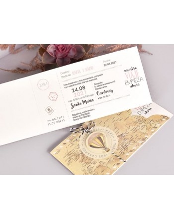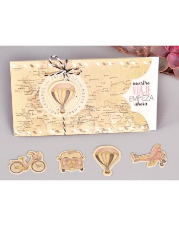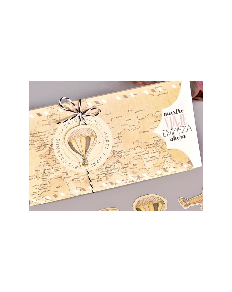 Para que podáis elegir en que queréis viajar, esta invitación os da varias opciones en forma de pegatina principal: un globo, un avión, una furgoneta o una bicicleta. Es ideal para novios emprendedores.